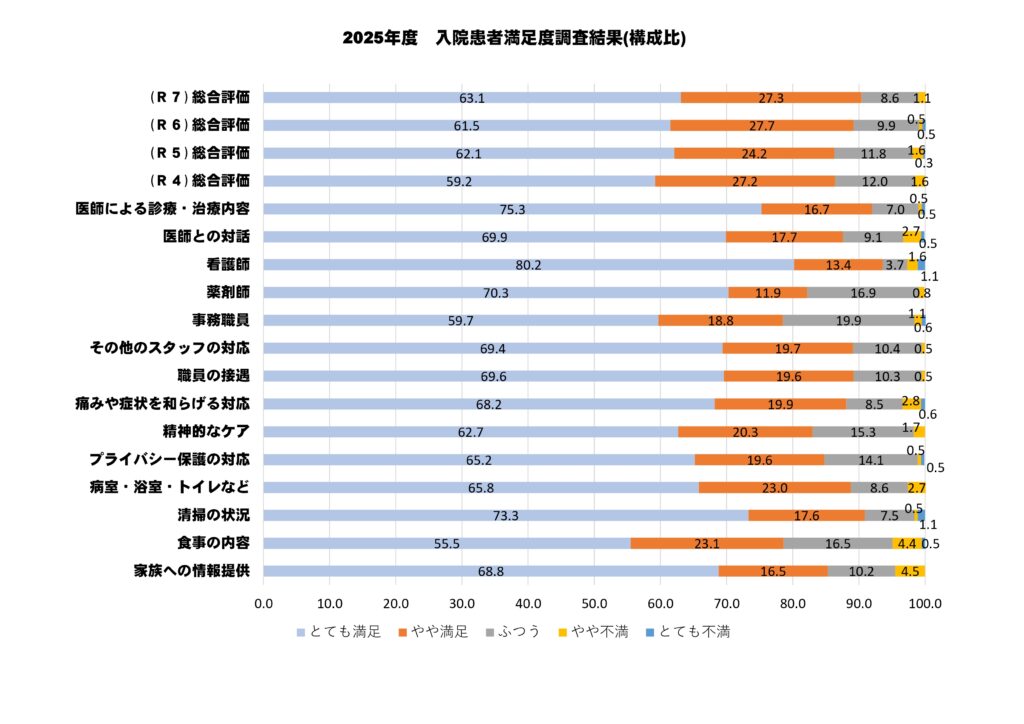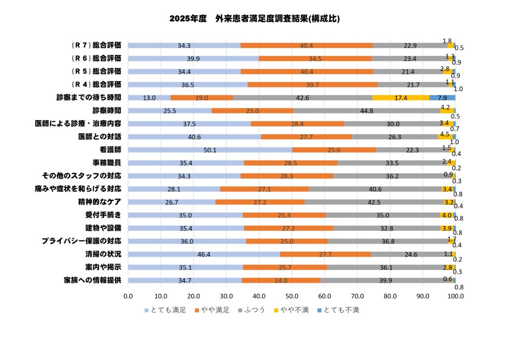 2025年の7月から9月に、入院患者さんと外来患者さんの満足度調査に取り組み、入院患者さん187人、外来患者さん947人から回答をいただきました。