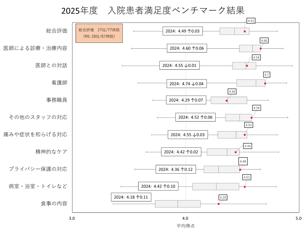 このアンケート調査に参加した全国の77病院中、総合評価の平均点は 27位となり、「事務職員」以外の項目で、全国の病院の平均点よりも高い点数となっています。特に、「病室、浴室、トイレなど」、「食事の内容」は77病院の上位25%以上に位置しています。