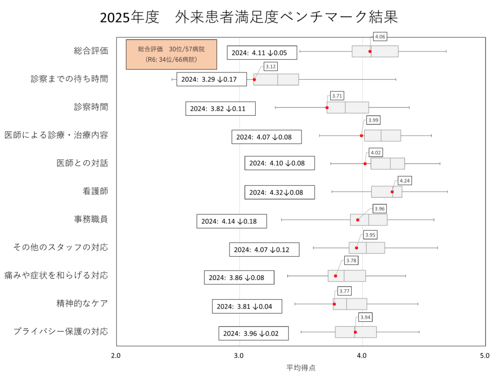 このアンケート調査に参加した全国の57病院中、総合評価の平均点は30位となり、全体の総合評価の平均点である4.07点を0.01ポイント下回りました。