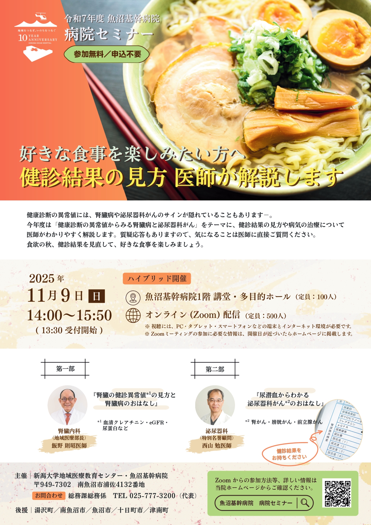 11月9日(日)、当院にて令和7年度魚沼基幹病院セミナーを開催します。