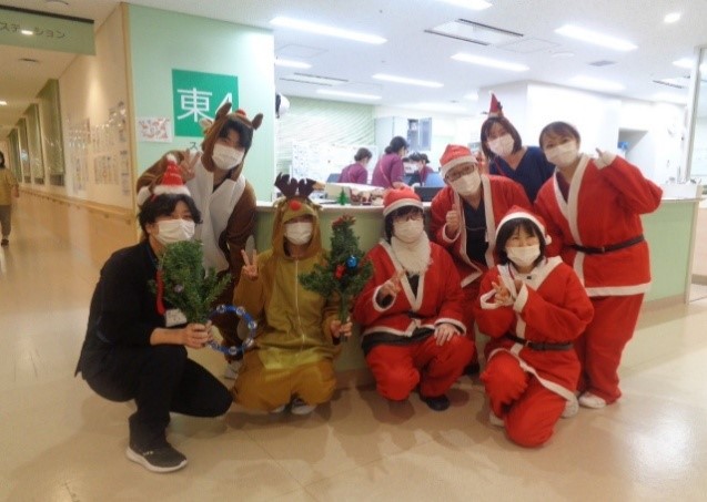 また、東4病棟では毎年「サンタプロジェクト」という小児患者さんを対象としたイベントを開催しています。小児科医師、病棟看護師がサンタクロースの衣装を着て、入院している小児患者さんに絵本のプレゼントを配る行事です。自宅で過ごせず、不安を抱えている小児患者さんに少しでも楽しく、前向きな気持ちになってもらえるように毎年取り組んでいます❣