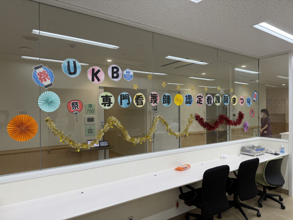 当院には、専門看護師・認定看護師あわせて11分野の看護師が在籍し、それぞれの専門性を活かして活動しています。一方で、患者さんのそばで日々ケアを積み重ねているのは、現場で働く職員一人ひとりです。そこで、「専門看護師・認定看護師の活動を知ってもらうこと」「顔の見える関係づくり」を目的に、昨年度から、「UKB☆専門看護師・認定看護師まつり」を開催しています。