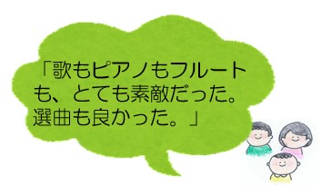 曲は、小さな世界、虹、さんぽです。合唱団で歌っているスタッフや、ピアノやフルートの演奏が好きなスタッフがこの日のために練習しました ❣ 参加された皆さんからの手拍子や歌声も聞こえてきて、とっても嬉しかったです。