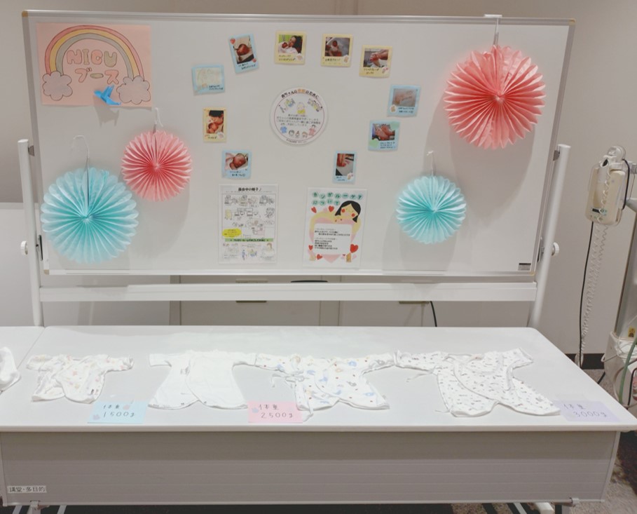 NICUブースでは、 NICUの雰囲気を懐かしく思ってもらえるように、NICUの入り口に飾っている写真やポスターを使って飾り付けしました。 卒業生たちがかつて着ていた服やおむつ、使っていたクッションを並べてみました。皆さん体に当ててみたり、手に取って楽しんでもらえたようです♪
