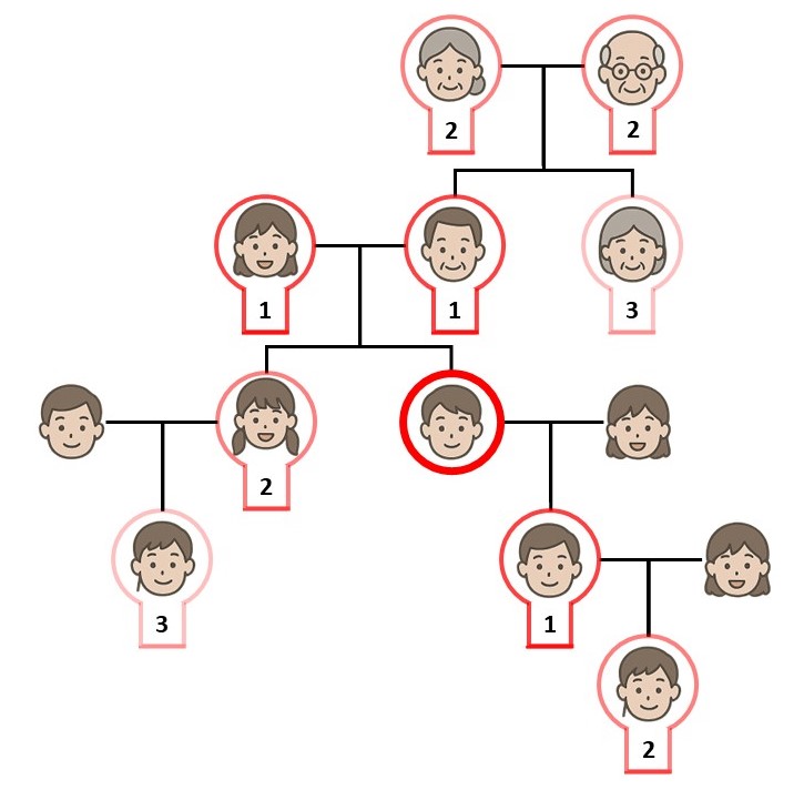 少なくとも3親等までのご親族に関して、遺伝カウンセリング外来の受診時に年齢、性別、生死、病気の情報などをご提供ください。